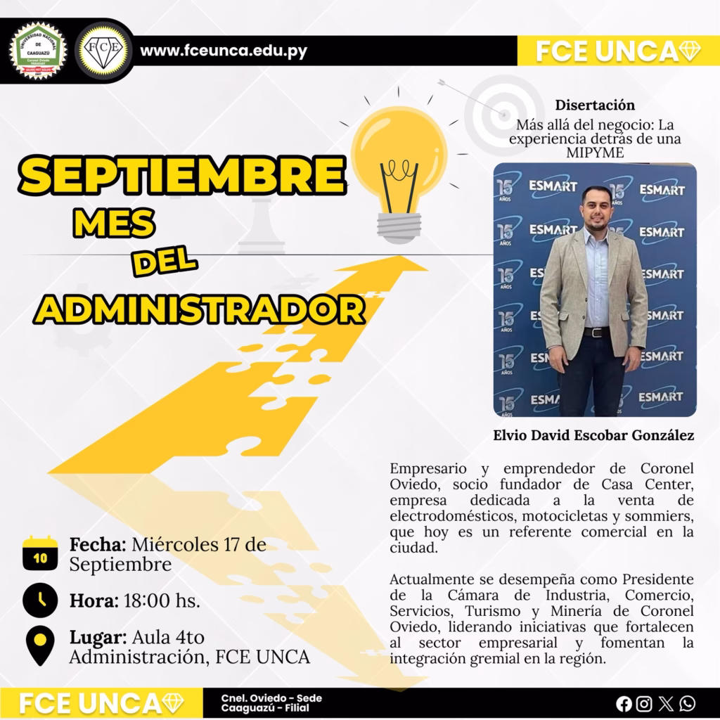En el marco de las celebraciones por el Mes del Administrador, la Facultad de Ciencias Económicas de la UNCA invita a participar de una charla inspiradora titulada: 👉 “Más allá del negocio: La experiencia detrás de una MIPYME” 📌 Disertante: Elvio David Escobar González, empresario y emprendedor ovetense, socio fundador de Casa Center, empresa referente…
