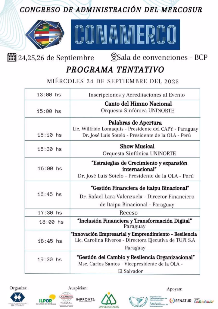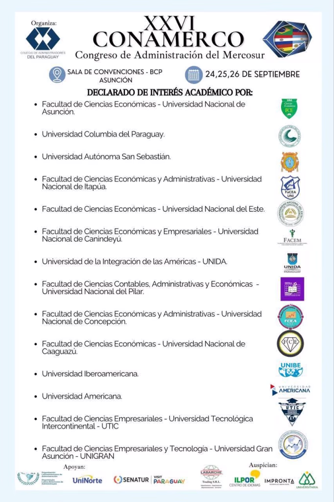 Mediante la Resolución del Consejo Directivo N° 142/2025 «Que Declara de Interés Académico para la Facultad de Ciencias Económicas de la Universidad Nacional de Caaguazú, el XXVI Congreso de Administradores del Mercosur – CONAMERCO 2025, organizado por el Colegio de Administradores del Paraguay«, la Facultad de Ciencias Económicas de la UNCA será partícipe del CONGRESO DE ADMINISTRACIÓN DEL MERCOSUR «CONAMERCO» a desarrollarse entre los días 24 al 26 de septiembre del 2025, a partir de las 13:00 horas en la Sala de Convenciones del BCP.