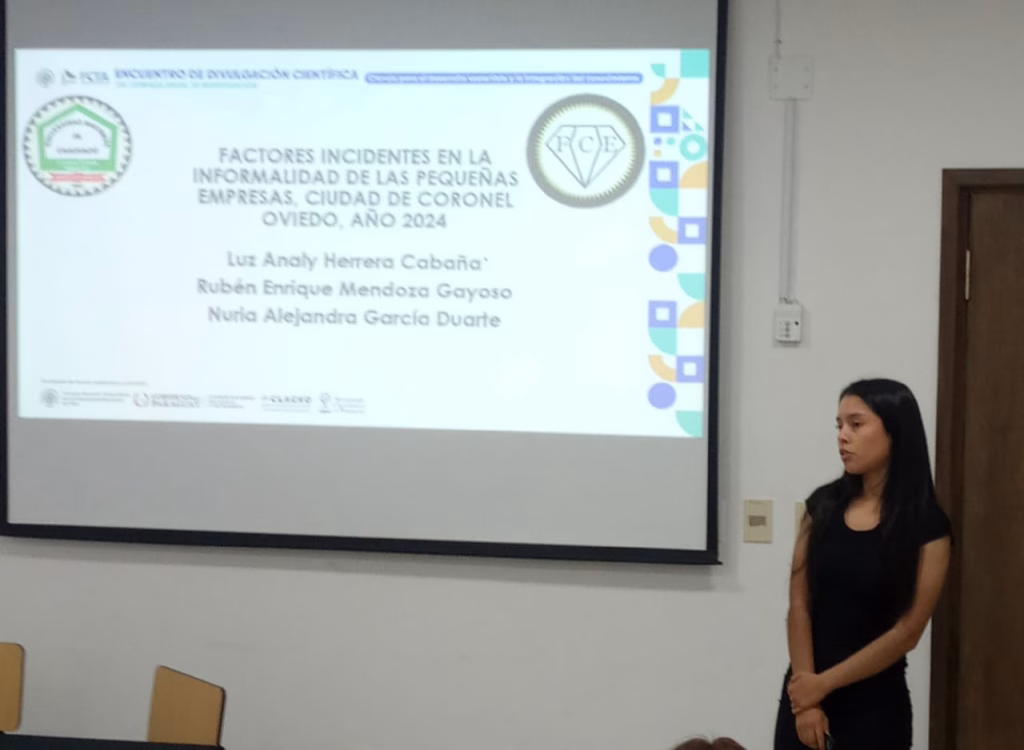 - “Factores incidentes en la informalidad de las pequeñas empresas en Coronel Oviedo, año 2024”, presentado por la estudiante universitaria Luz Analy Herrera Cabaña, del 2° curso de la carrera de Economía.