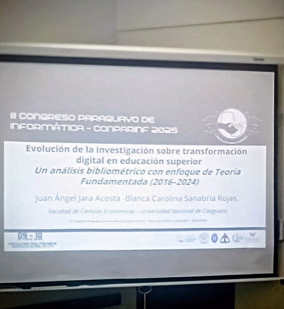 El pasado viernes 10 del corriente, la Prof. Lic. Blanca Carolina Sanabria Rojas y el Prof. Mg. Juan Ángel Jara Acosta, han presentado una investigación sobre el tema «Evolución de la investigación sobre transformación digital en la Educación Superior» en el III Congreso Paraguayo de Informática, organizada por la Facultad Politécnica de la Universidad Nacional del Este. La FCE UNCA felicita y celebra la disposición de los docentes en generar producciones intelectuales de interés colectivo.