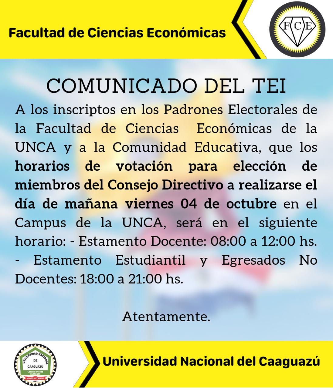 En relación a la elección de los miembros del Consejo Directivo a realizarse el viernes 04 de octubre del corriente, conforme al Calendario Electoral establecido por el Tribunal Electoral Independiente de la Facultad de Ciencias Económicas de la UNCA.