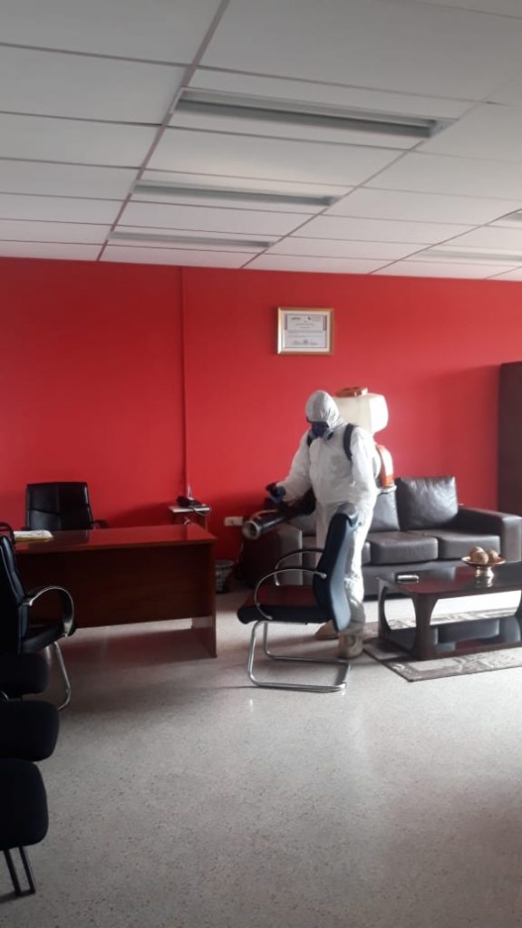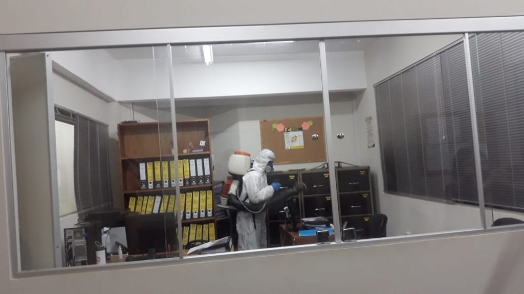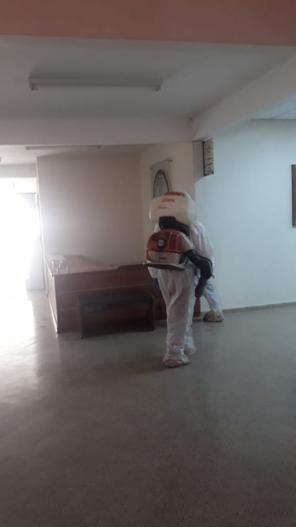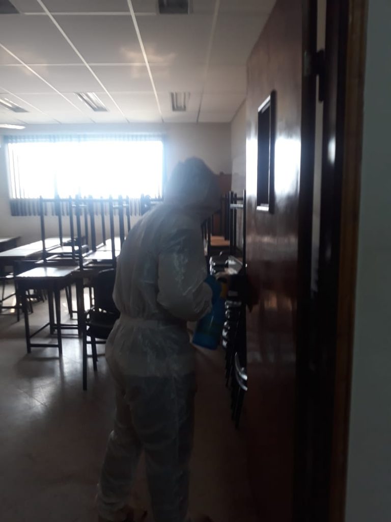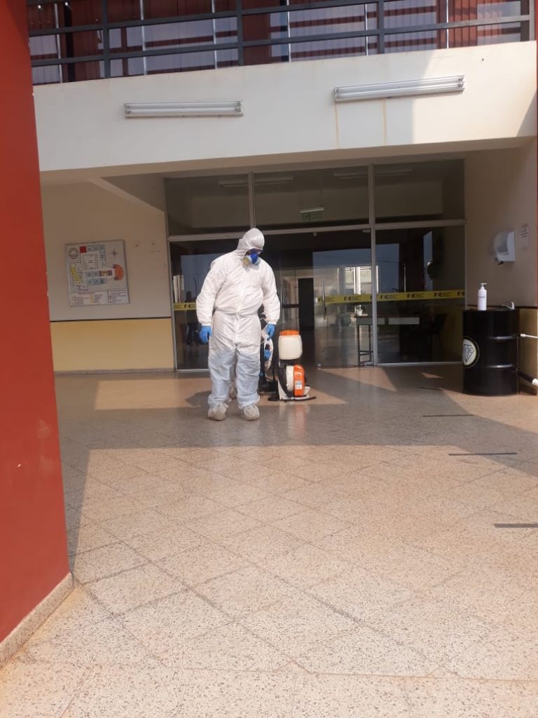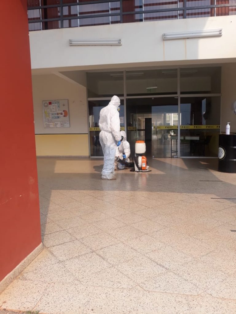 En estos momentos, se realizan los trabajos de desinfección de todos los sectores de la Facultad de Ciencias Económicas de la UNCA, a través del personal técnico autorizado para dicho operativo en las áreas de trabajo y circulación comunitaria del Campus.