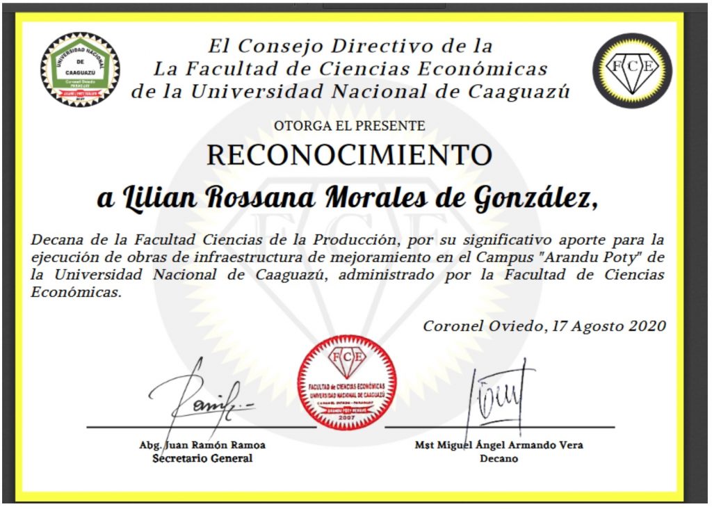 En la fecha se llevó a cabo la Sesión Extraordinaria del Consejo Directivo de la Facultad de Ciencias Económicas de la UNCA, con la presencia de la Dra. Lilian Rossana Morales, Decana de la Facultad Ciencias de la Producción de la UNCA y todos los miembros del Consejo Directivo de dicha Unidad Académica, siendo el único orden del día el Reconocimiento a la FCP por su significativo aporte en la ejecución de obras para el mejoramiento de la infraestructura del Campus “Arandu Poty” de la Universidad Nacional de Caaguazú.