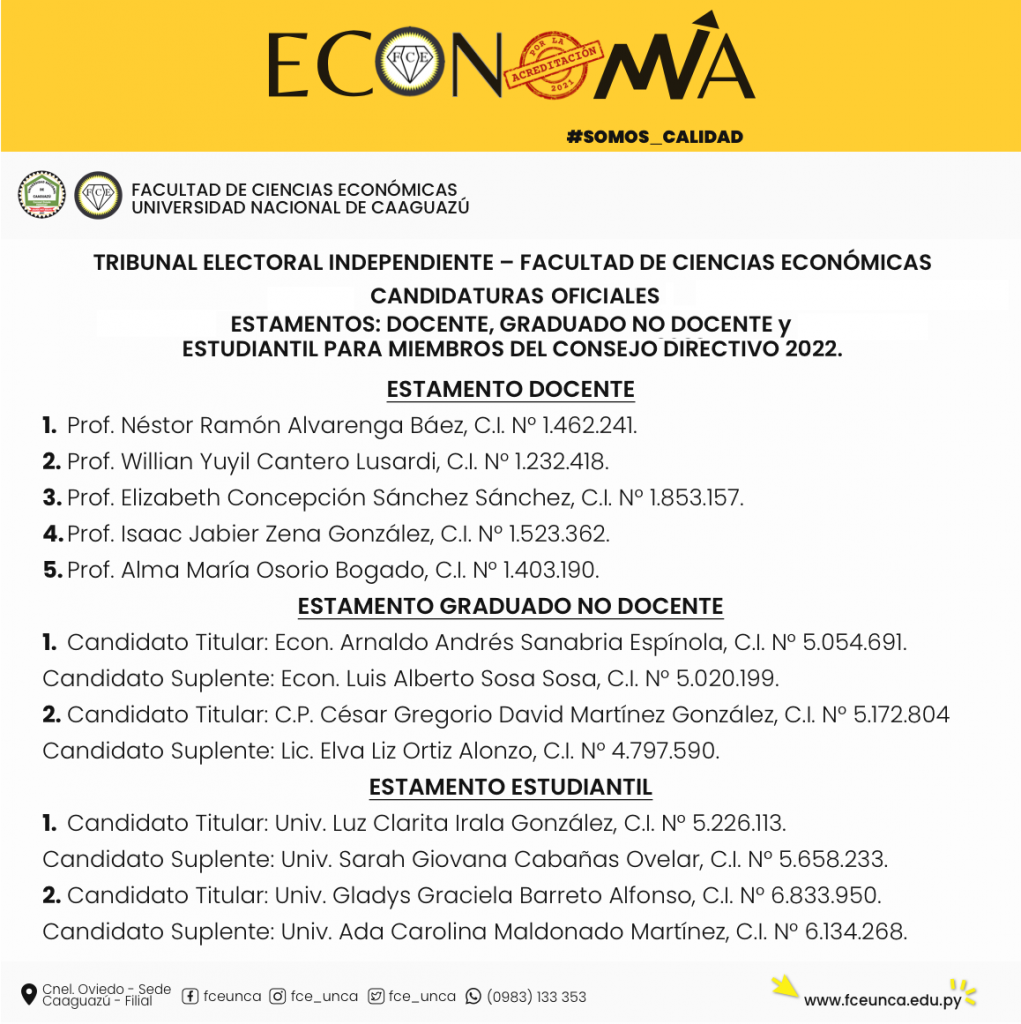 El Tribunal Electoral Independiente de la Facultad de Ciencias Económicas de la UNCA, comunica la oficialización de las candidaturas para miembros del Consejo Directivo de esta Unidad Académica para el periodo 2022, para los estamentos Docente, Graduados No Docente y Estudiantil.