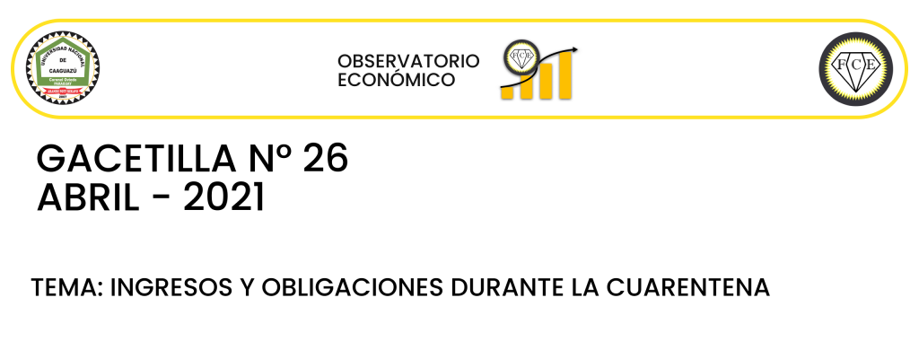 En lo que respecta a los ingresos, se observa que, en la ciudad de Coronel Oviedo, el 53% mantuvieron el mismo nivel, el 52% sufrieron disminuciones y el 3% tuvieron aumentos. Mientras que, en la ciudad de Caaguazú, el 51% tuvieron disminuciones en sus niveles promedios, 43% lograron mantener y el 6% obtuvieron aumentos. En cuanto a las obligaciones financieras (préstamos, pagos de cuotas, etc.), la tendencia en ambas ciudades es la misma, donde el mayor porcentaje de los encuestados no pudieron hacer frente a sus obligaciones durante la cuarentena (65% C.O. y 54% CA.). Con estos datos, se pude decir que en la ciudad donde existió una mayor variación de ingresos fue en Caaguazú, y en lo que respecta a las obligaciones financieras, en ambas ciudades se registró la misma tendencia de incumplimiento por incapacidad financiera.